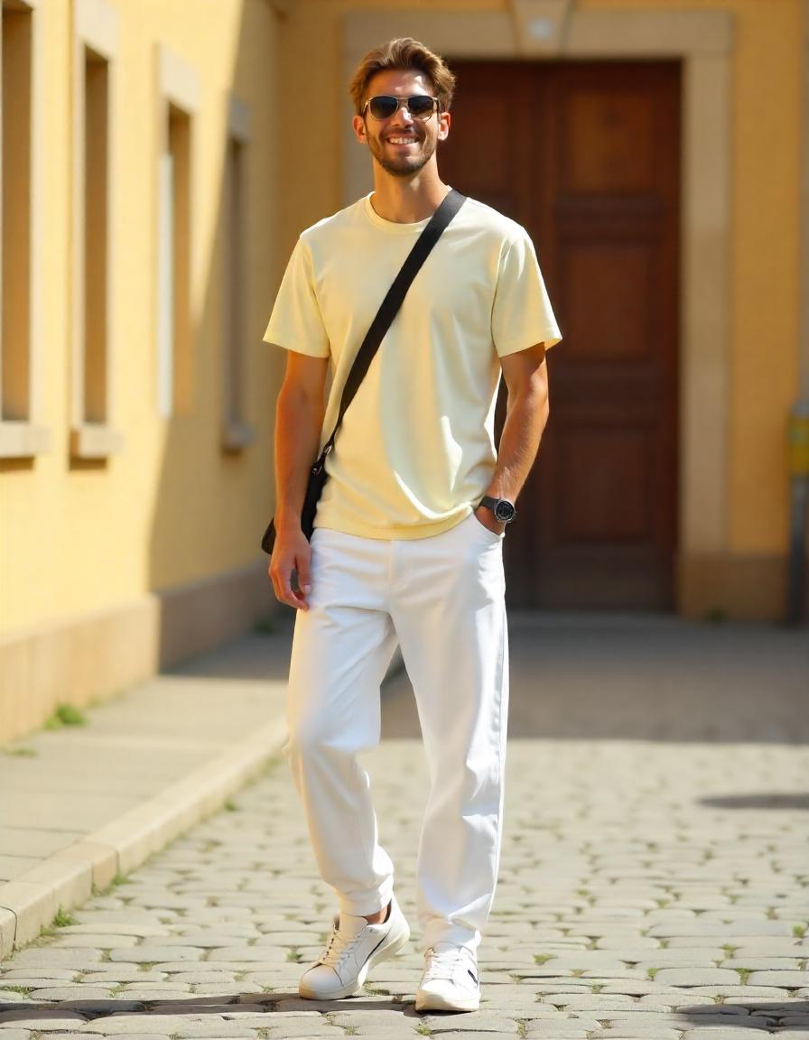 For casual weekends, I like to keep things simple yet stylish. A relaxed white jeans outfit with a basic crew neck men’s t-shirt and sneakers never fails me. The key is to balance the brightness of the jeans with neutral or pastel shades on top. I often go for Urbano’s fitted t-shirts in subtle hues like beige or powder blue. If I’m feeling a bit more adventurous, I throw on a lightweight denim jacket for that extra edge.