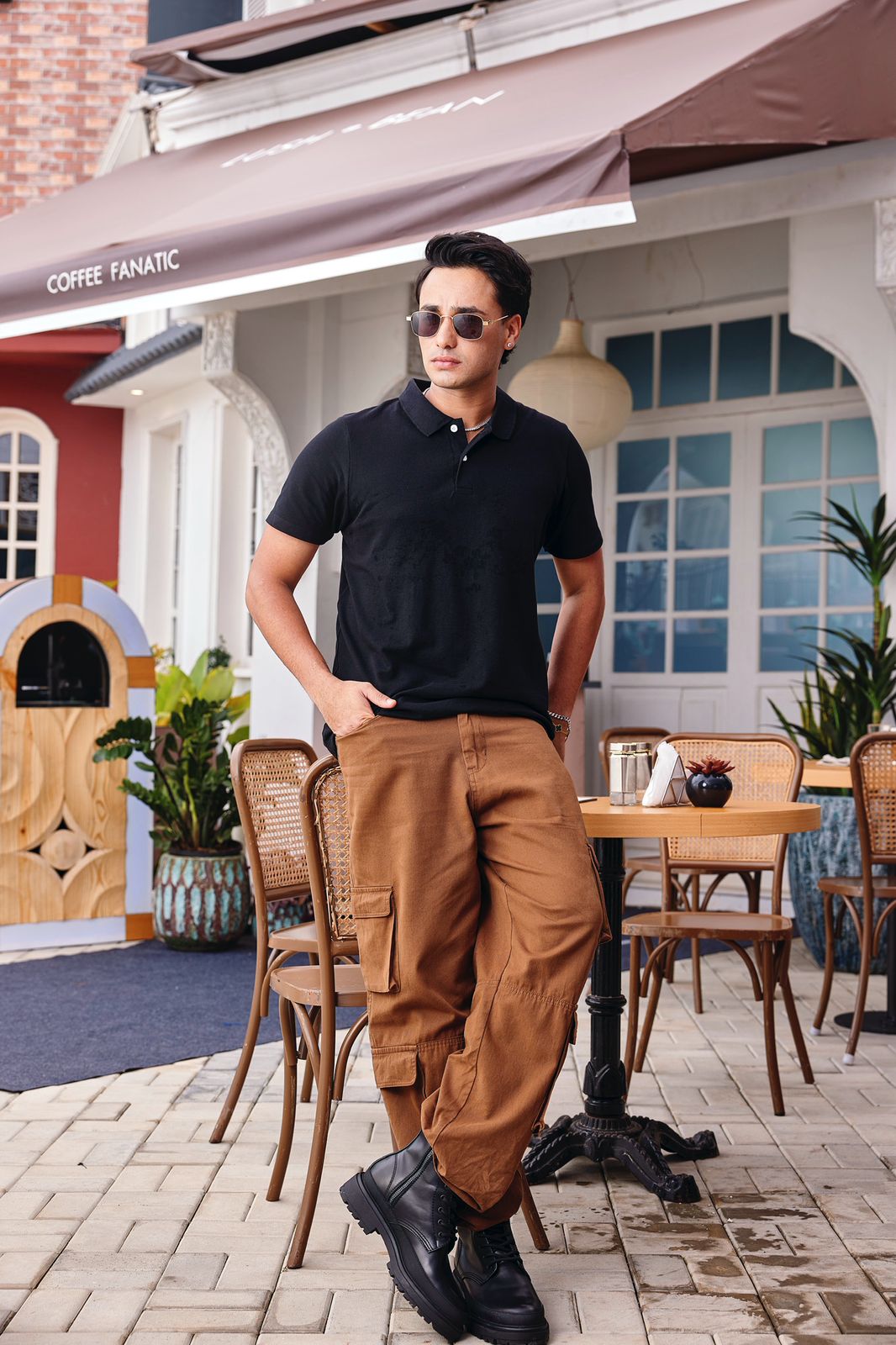Start with the basics. Go for black cargos, a solid tee (Urbano’s got killer options in navy, black, olive, and white) keeps your outfit grounded. Tuck in slightly or let it hang loose - either way, pair with white sneakers for that easy-going everyday aesthetic.