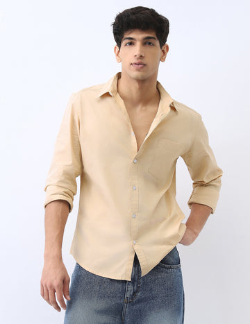 Men's Beige Cotton Full Sleeve Regular Fit Casual Solid Shirt