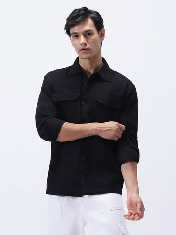 Men's Black Cotton Full Sleeve Relaxed Fit Shacket with Utility Pockets