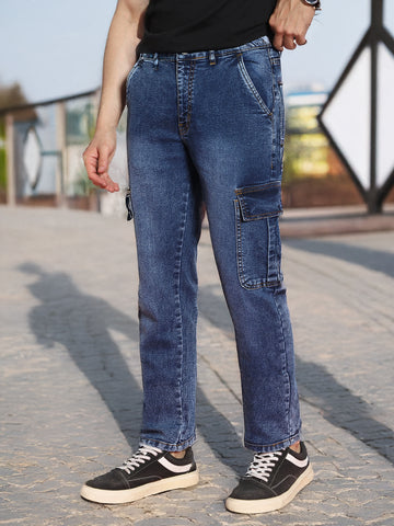 Men's Blue Regular Fit Washed Cargo Jeans With 6 Pockets Stretchable
