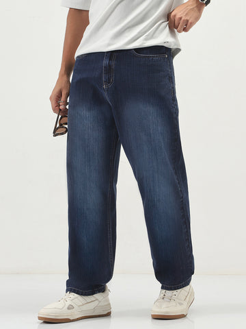 Men's Dark Blue Loose Baggy Fit Washed Denim Jeans Non-Stretchable