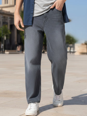 Men's Grey Loose Baggy Fit Washed Jeans Non-Stretchable