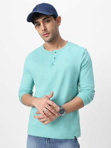 Men's Nile Blue Solid Henley Neck Slim Fit Full Sleeve Cotton T-Shirt