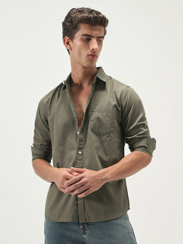 Men's Olive Cotton Full Sleeve Regular Fit Casual Solid Slub Shirt with Spread Collar