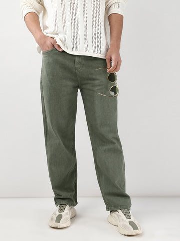 Men's Olive Green Loose Fit Washed Jeans Non-Stretchable
