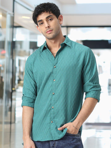 Men's Turquoise Cotton Full Sleeve Regular Fit Textured Shirt with Spread Collar