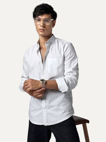 Men's White Cotton Full Sleeve Regular Fit Solid Oxford Shirt With Button-Down Collar