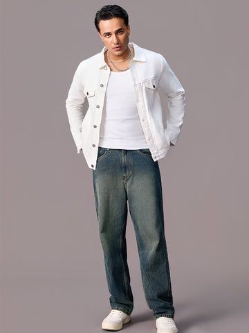 Men's White Regular Fit Washed Full Sleeve Denim Jacket