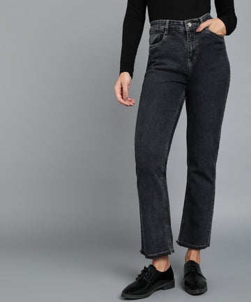Women's Black Regular Fit Wide Leg Washed Jeans