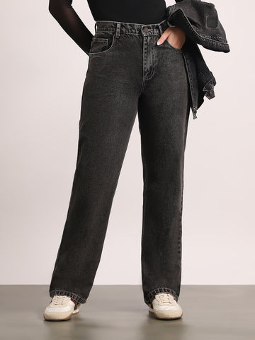 Women's Grey High Rise Straight Fit Washed Jeans Non-Stretchable