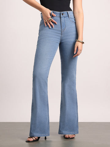 Women's Light Blue Mid Rise Bootcut Fit Washed Jeans Stretchable