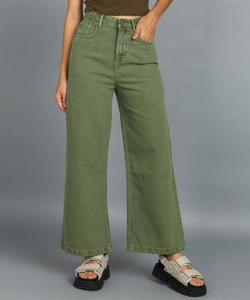Women's Olive Green Regular Fit Wide Leg Washed Jeans