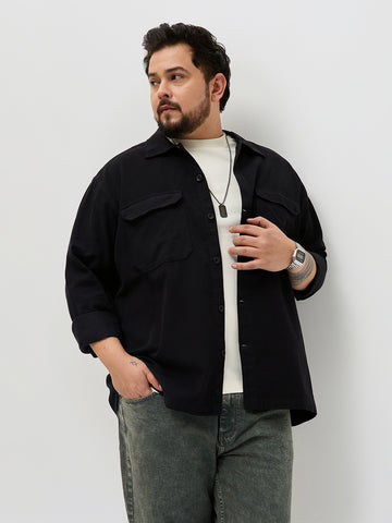 Plus Men's Black Cotton Full Sleeve Relaxed Fit Shacket with Utility Pockets