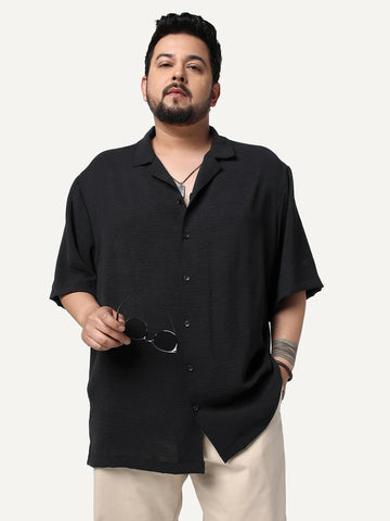 Plus Men's Black Cotton Half Sleeve Relaxed Fit Textured Shirt with Cuban Collar