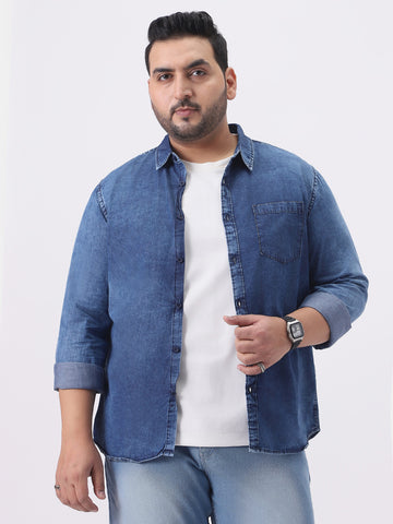 Plus Men's Blue Regular Fit Full Sleeve Washed Denim Shirt