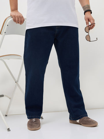 Plus Men's Blue Straight Fit Raw Washed Denim Jeans Stretchable