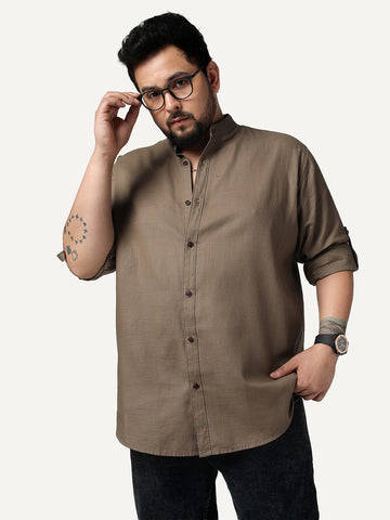 Plus Men's Coffee Linen Blend Full Sleeve Relaxed Fit Mandarin Collar Casual Solid Shirt