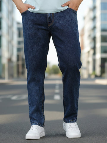 Plus Men's Dark Blue Regular Fit Washed Jeans Stretchable