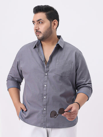 Plus Men's Grey Cotton Full Sleeve Regular Fit Casual Solid Slub Shirt with Spread Collar