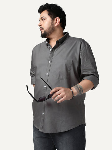 Plus Men's Grey Cotton Full Sleeve Regular Fit Solid Oxford Shirt With Button-Down Collar