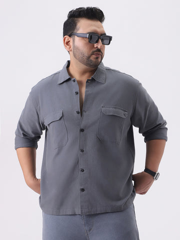 Plus Men's Grey Cotton Full Sleeve Relaxed Fit Shacket with Utility Pockets