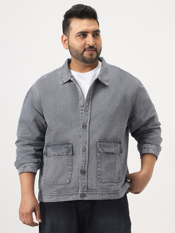 Plus Men's Grey Relaxed Fit Full Sleeve Utility Denim Jacket