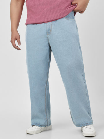 Plus Men's Ice Blue Loose Fit Washed Jeans Non-Stretchable