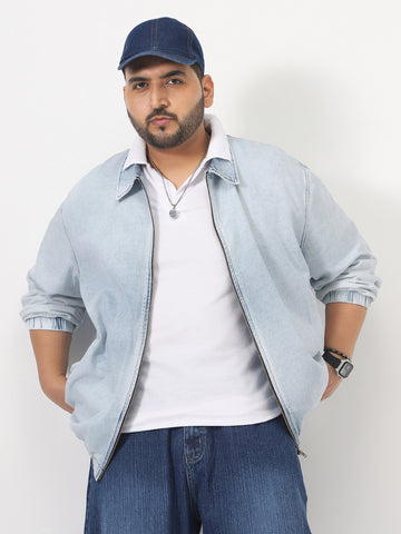 Plus Men's Ice Blue Relaxed Fit Full Sleeve Harrington Denim Jacket