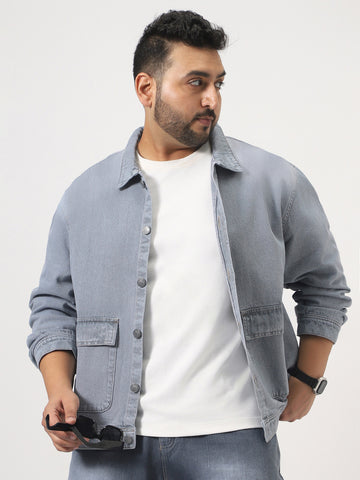 Plus Men's Ice Grey Relaxed Fit Full Sleeve Utility Denim Jacket