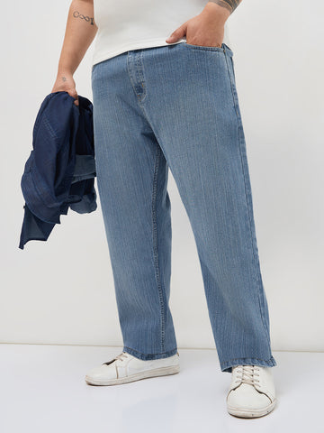 Plus Men's Light Blue Straight Fit Washed Denim Jeans Stretchable