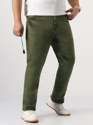 Plus Men's Light Green Straight Fit Heavy Washed Jeans Stretchable